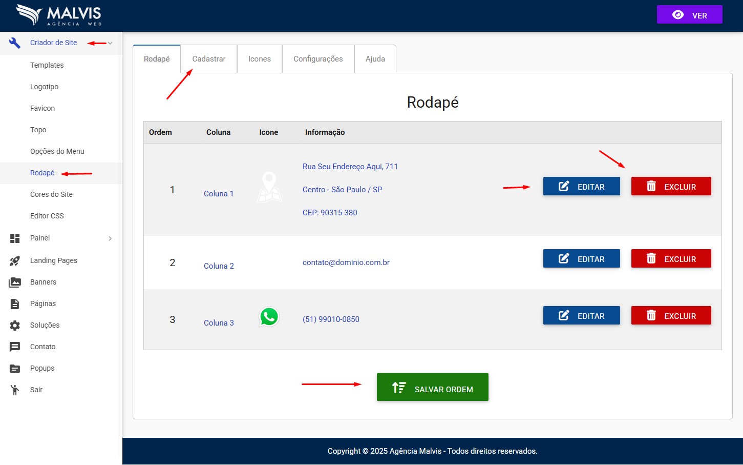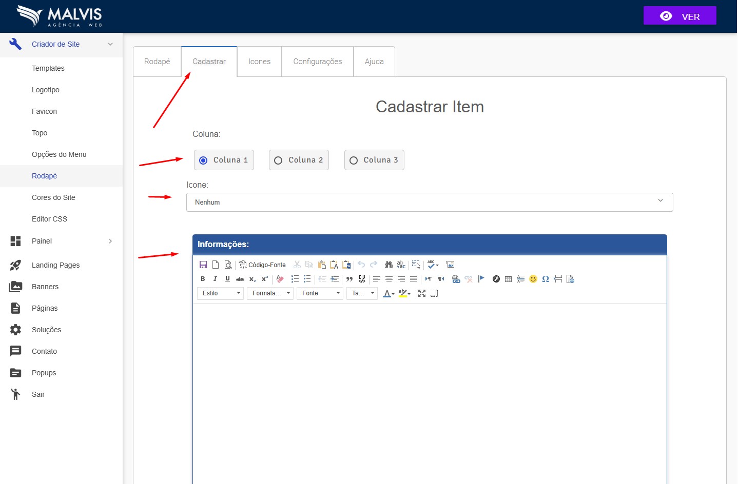 Acesse o criador e clique no menu: Criador de Site / Rodapé