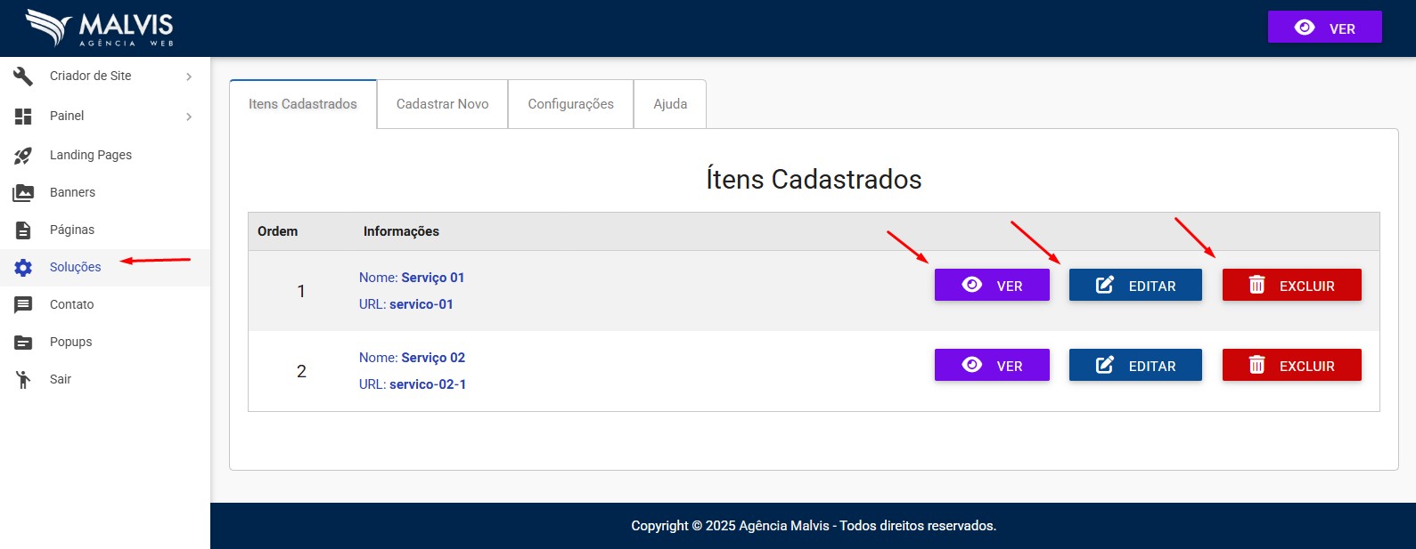 Para excluir um serviço cadastrado, basta clicar no botão Excluir e está pronto!