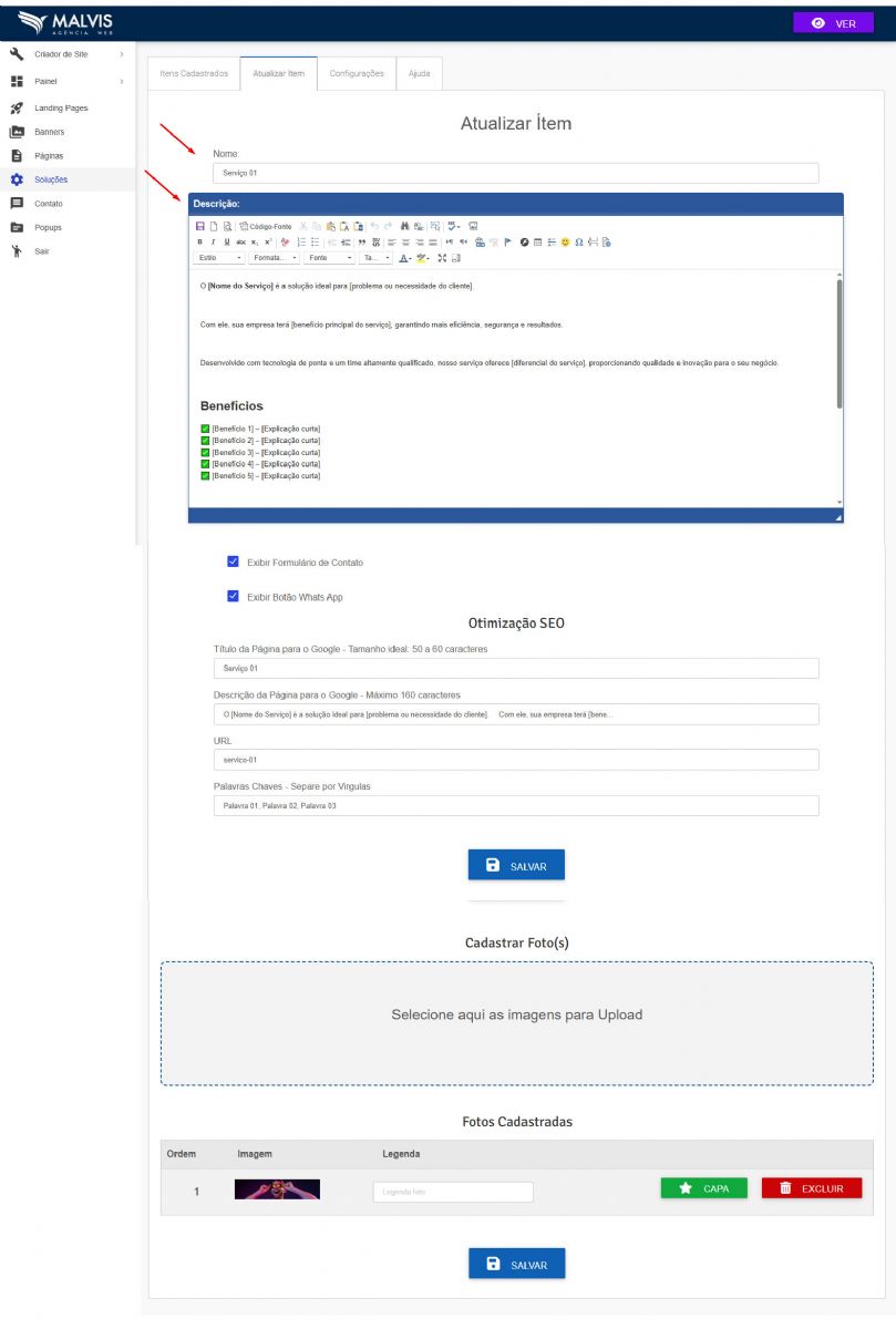 Após cadastrar o serviço, role a página para baixo e cadastre uma foto Capa para o Serviço.