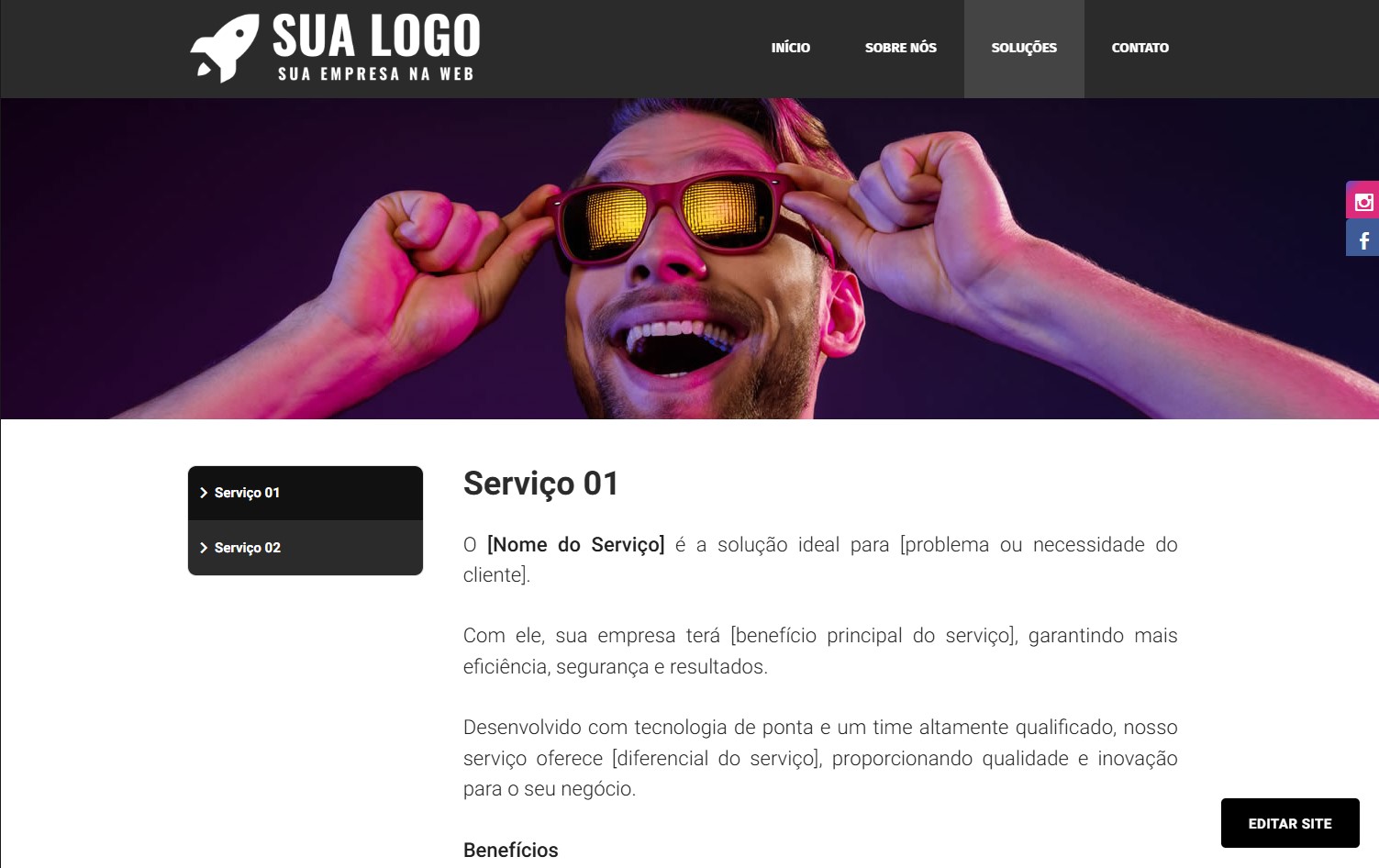 O Tipo de Página Serviços, normalmente é utilizado para apresentação de Soluções e Serviços oferecidos.