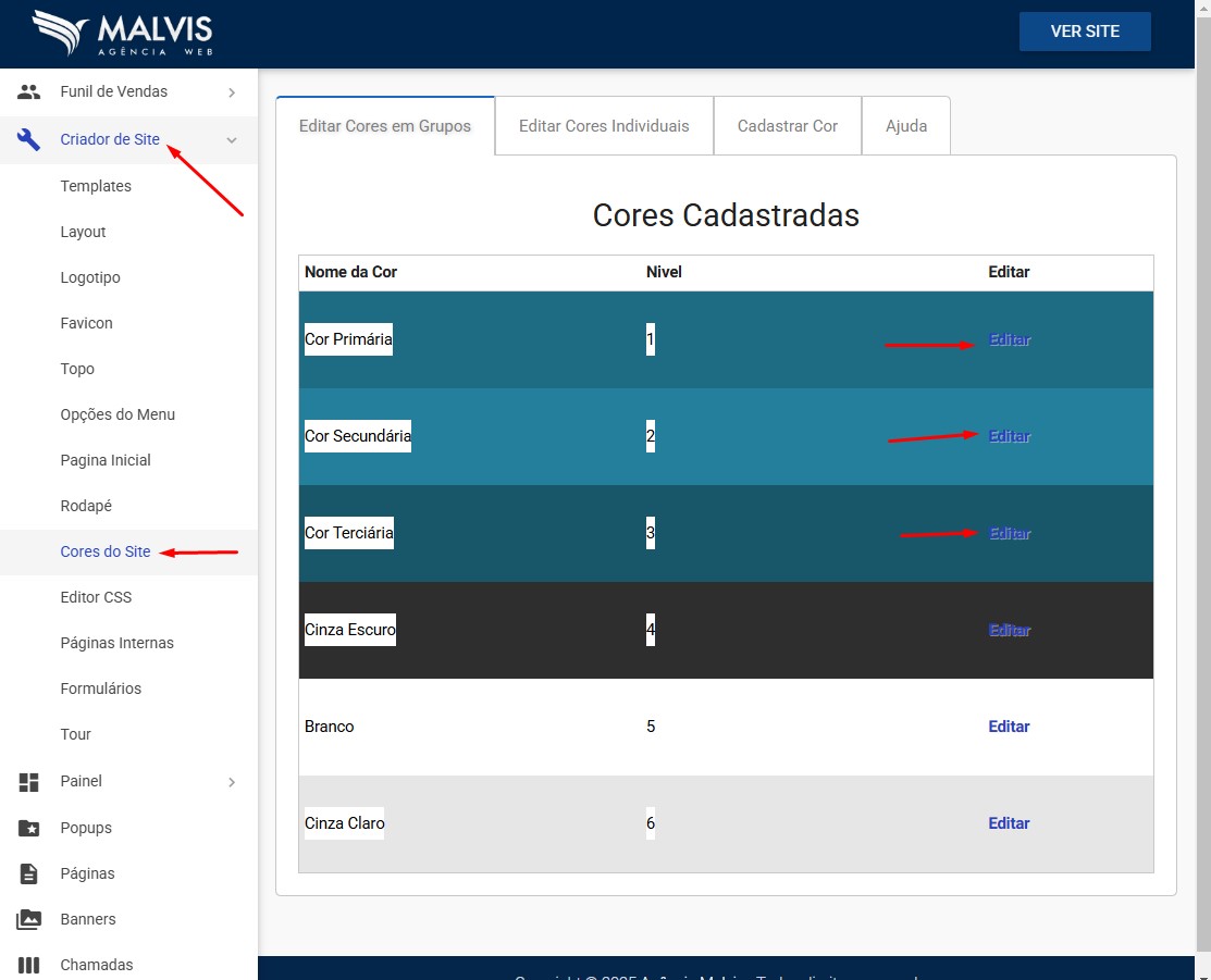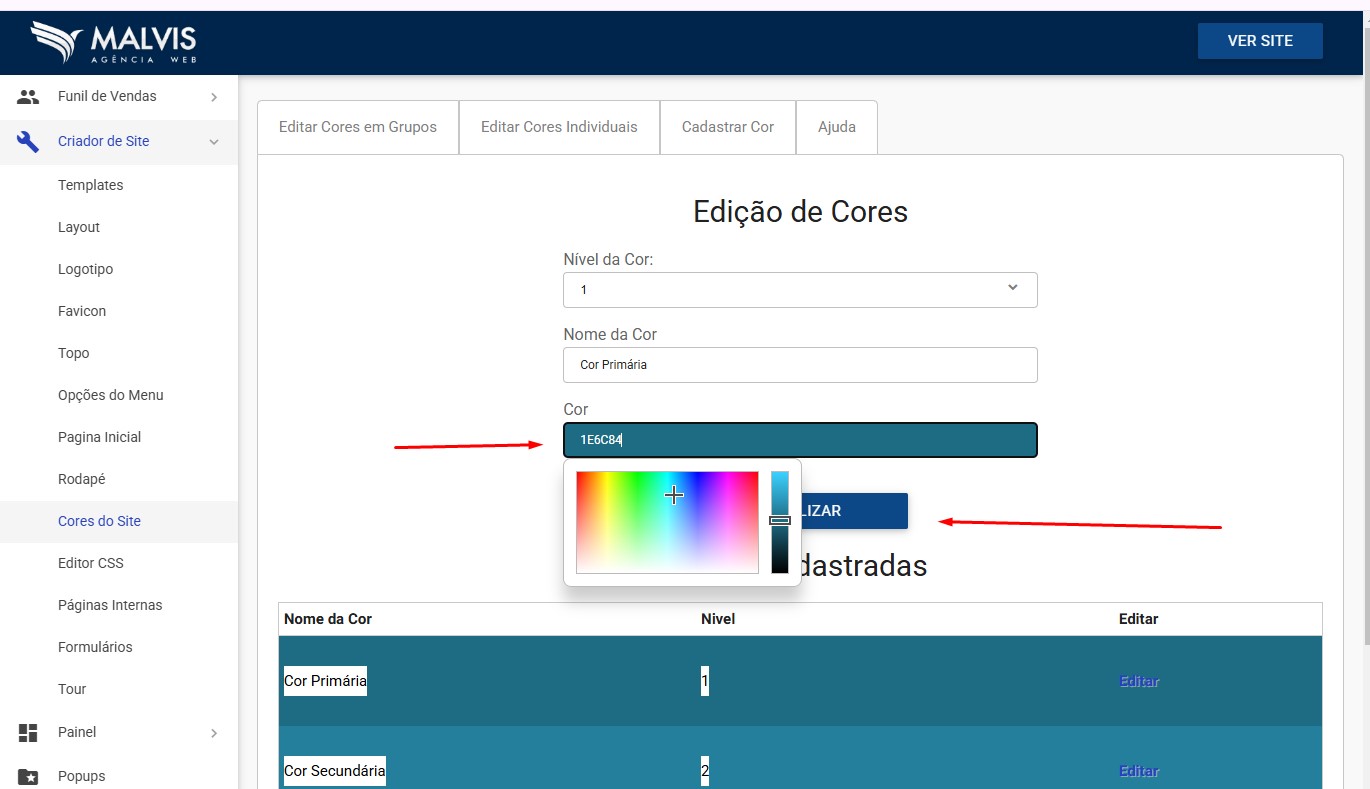 Para atualizar as cores do site, basta acessar o gerencidor de conteúdo, no menu Criador de Site / Cores.