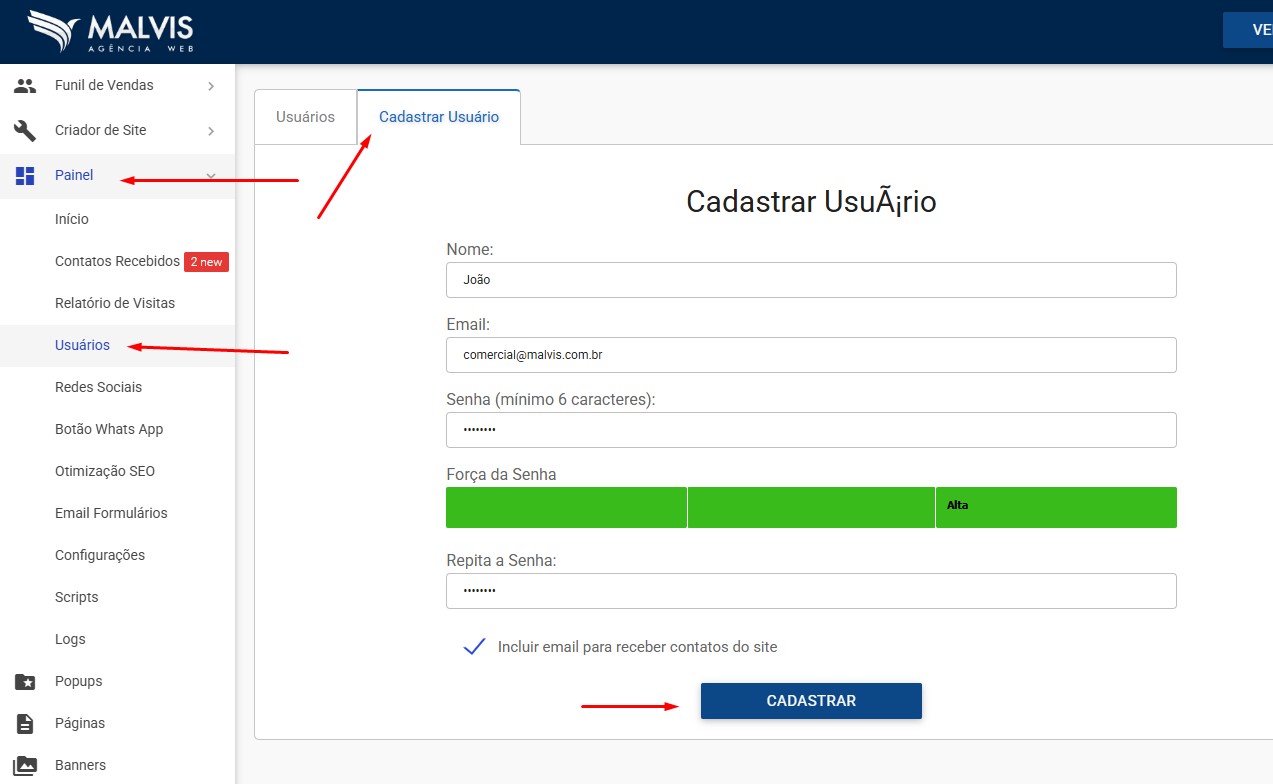 Acesse o Gerenciador de Conteúdo no menu Painel / Usuários e clique na aba em Cadastrar Usuário.