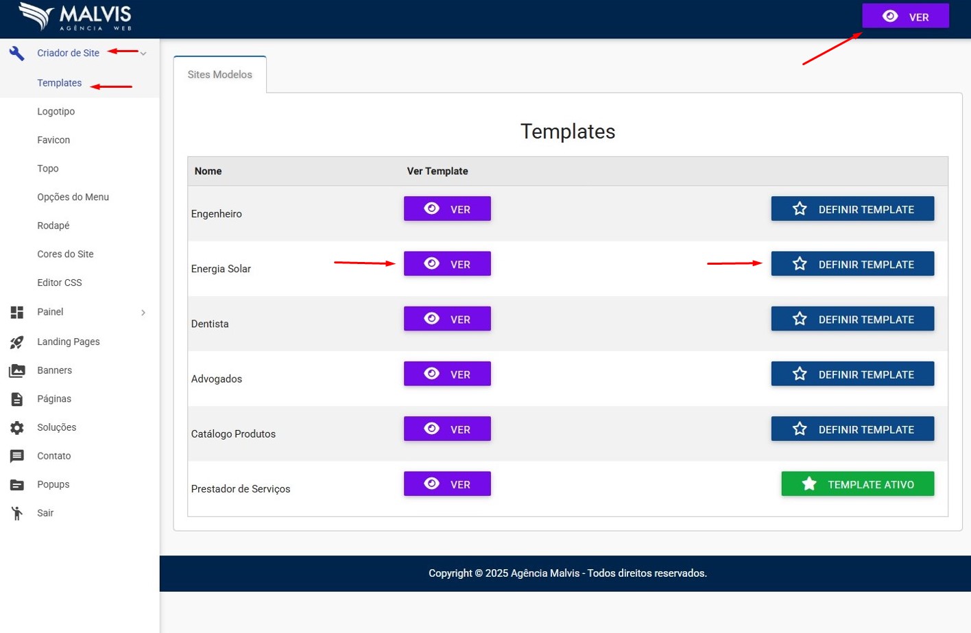 Logo depois de Definir Template, pode clicar no botão roxo Ver (no canto superior direito) para ver o site atualizado.