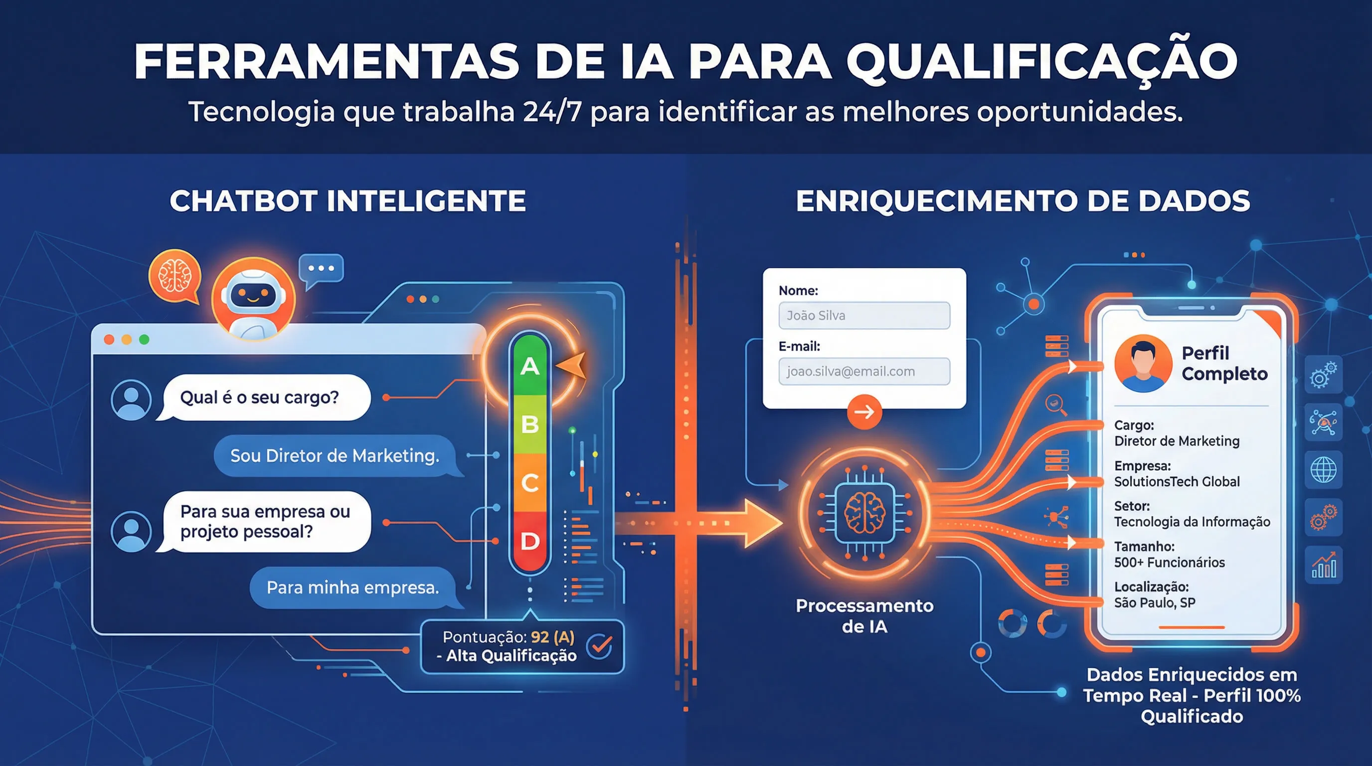 Dessa forma, um decisor com perfil adequado recebe prioridade imediata, enquanto leads fora do perfil entram automaticamente em fluxos de nutrição.