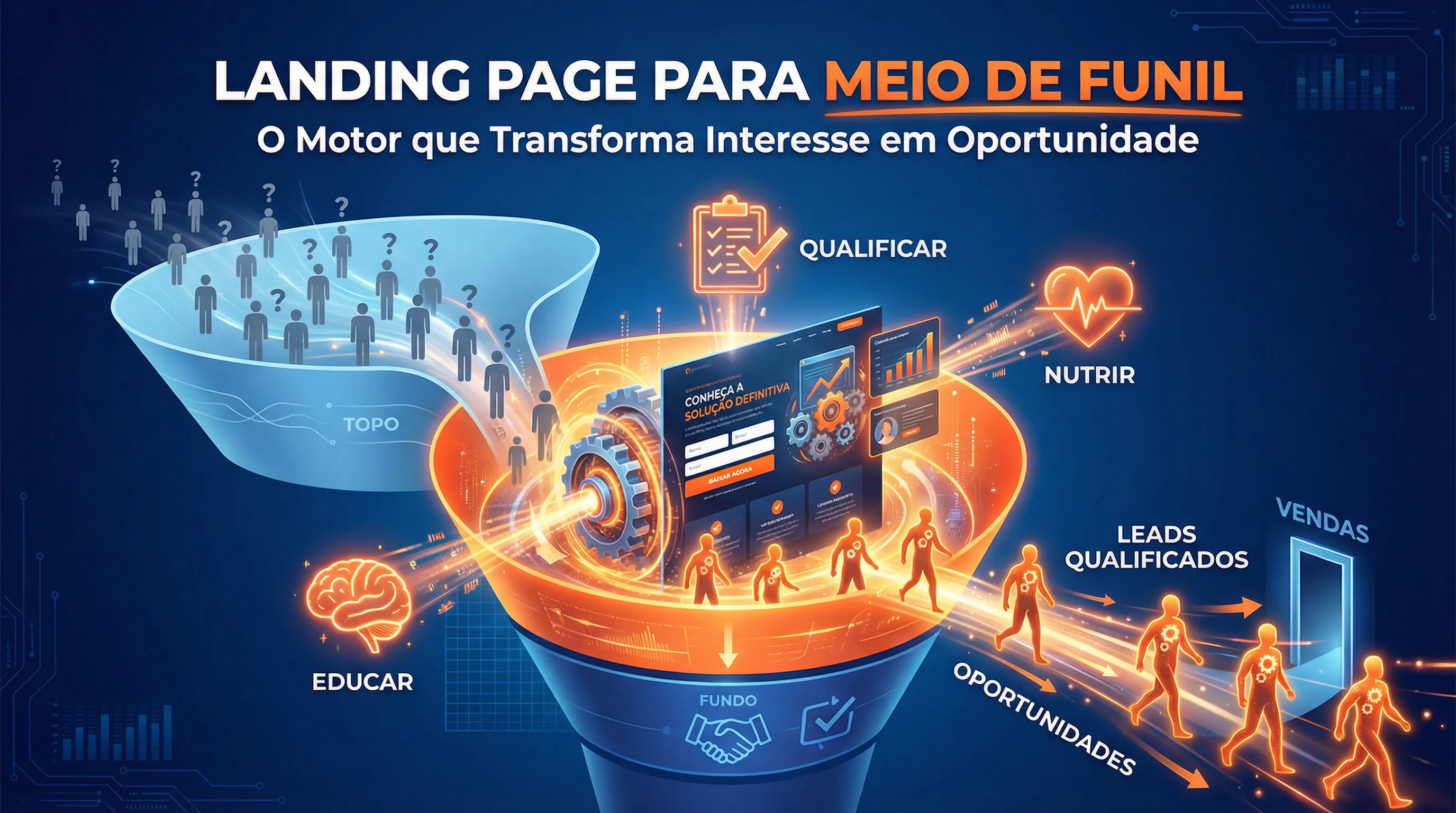 Enquanto uma landing page de topo captura contatos e uma de fundo fecha vendas, a landing page de meio de funil tem uma missão estratégica: educar, qualificar e nutrir o lead.