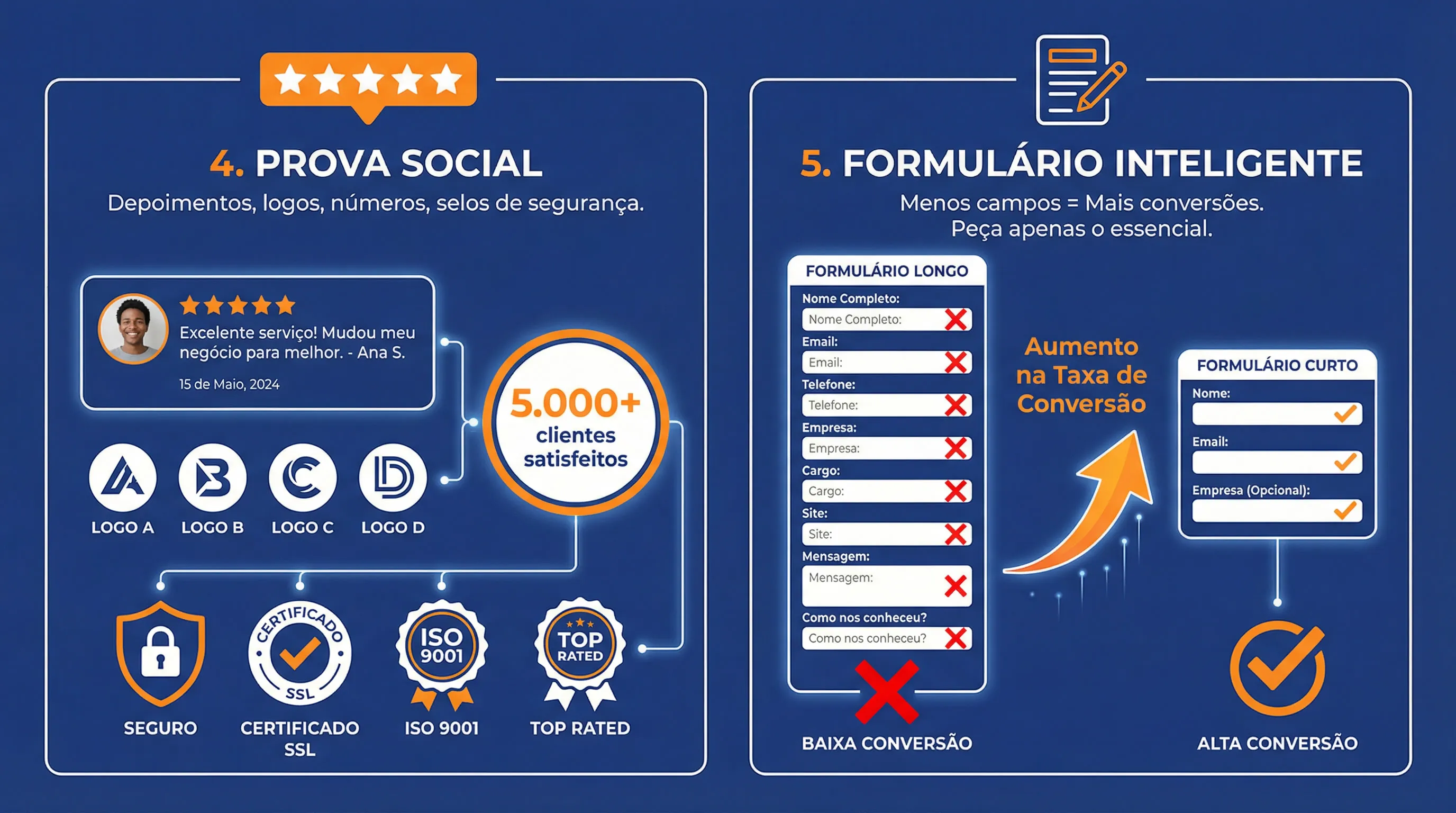 Depoimentos reais, estudos de caso, números de resultados e logos de clientes ajudam a validar a decisão do visitante.