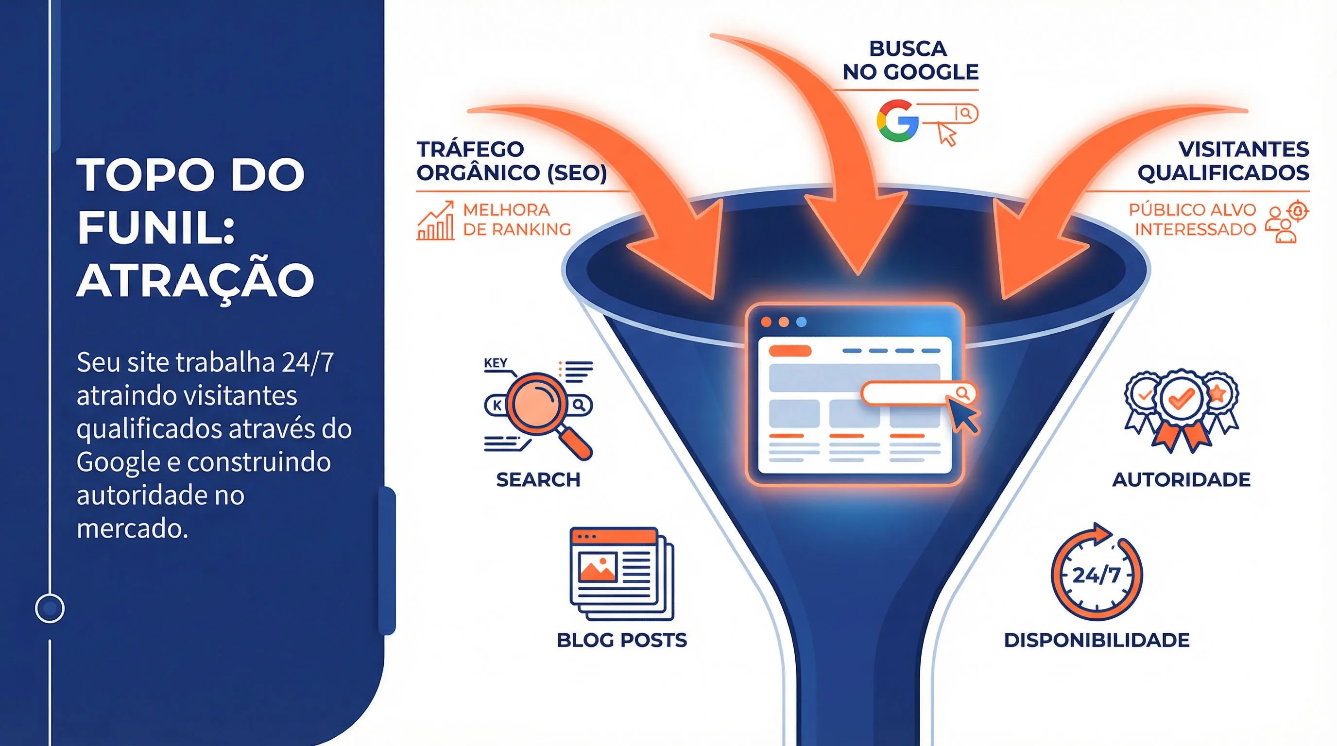 Cada página de serviço, cada artigo de blog e cada conteúdo publicado se transforma em uma nova porta de entrada para o seu funil de vendas.