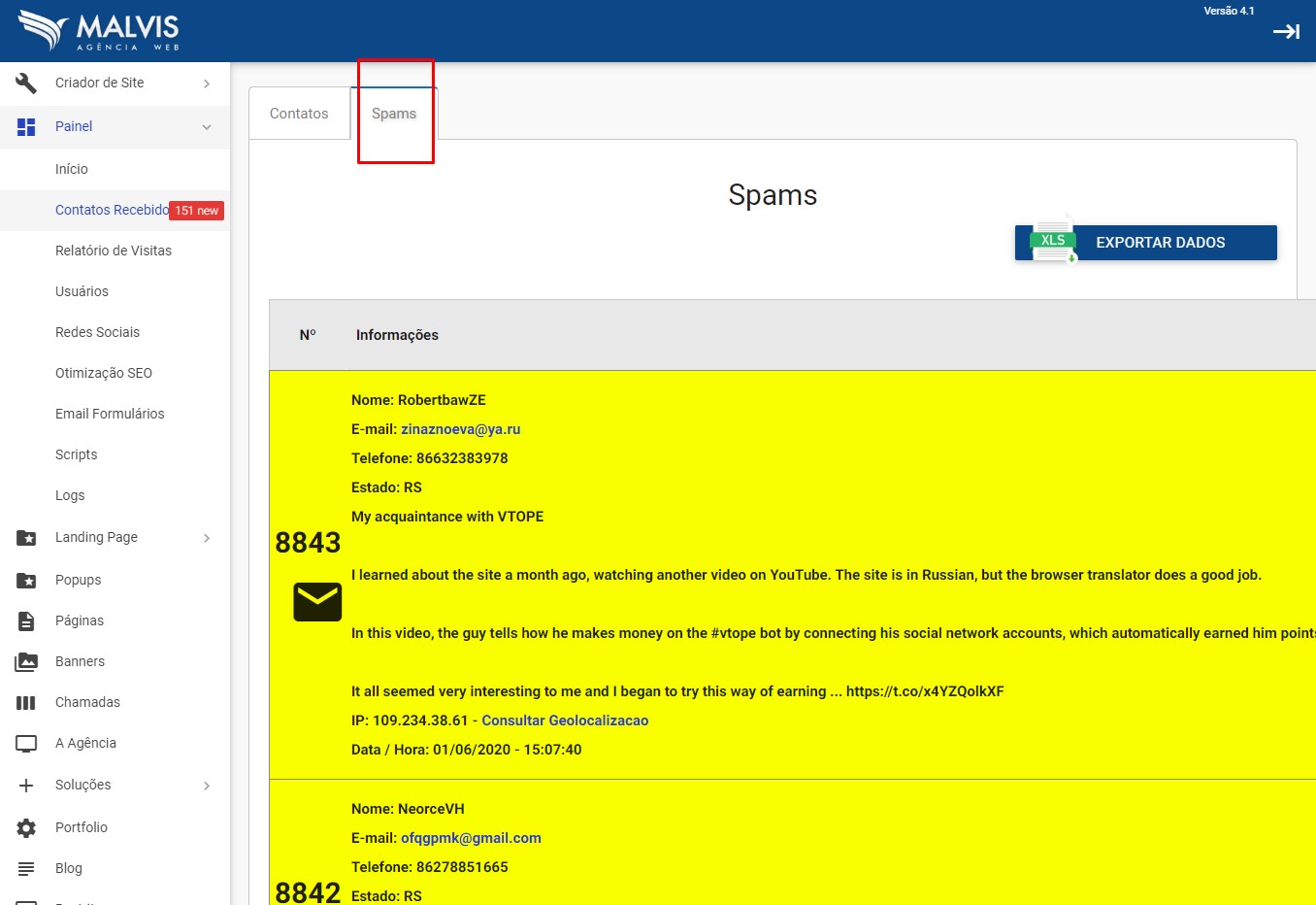 6 - Antispam nos formulários de contato - Sabe aquele monte de propaganda e mensagens em branco que entrada toda hora nos formulários de contato? Poisé... nós desenvolvemos um filtro antispam para essas mensagens indesejadas, enviadas por robôs programados para enviar propagandas nos formulários de contato do site. Agora, essas mensagens não são mais disparadas por email, e ficam retidas num filtro antispam que pode ser consultado dentro do gerenciador de conteúdo do site.