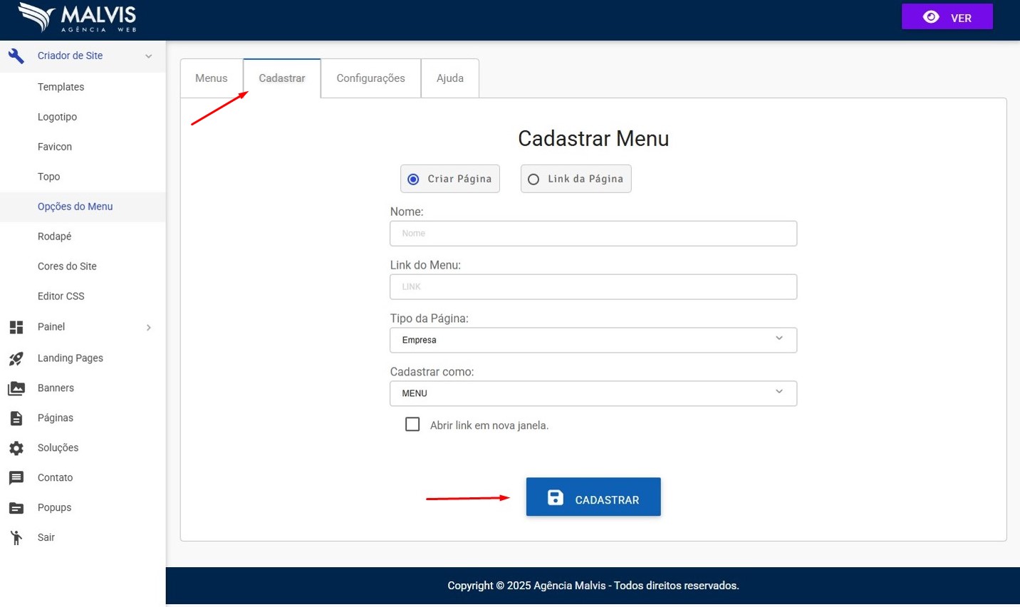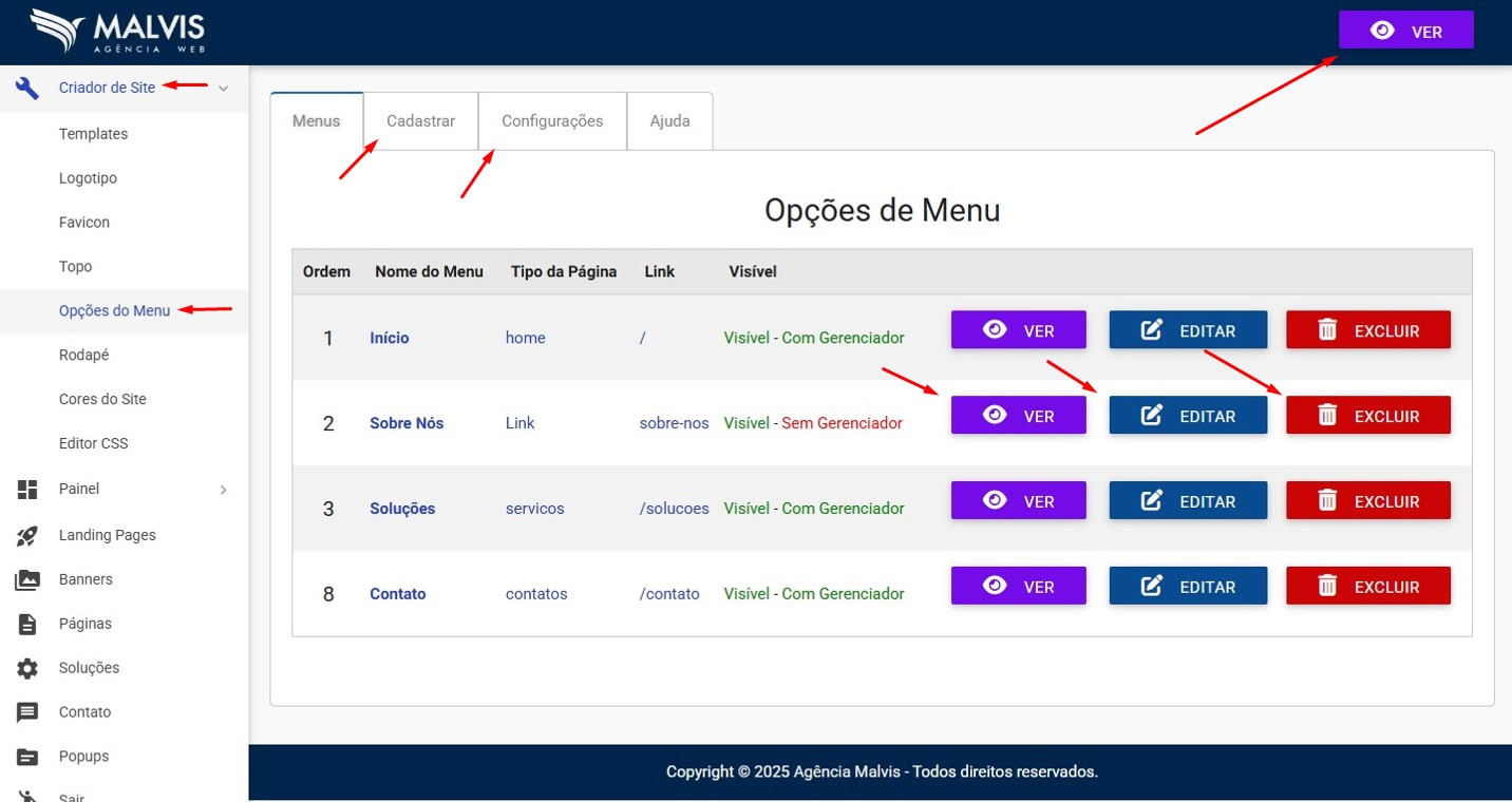 Acesse o Criador no menu: Criador de Site / Opções de Menu.