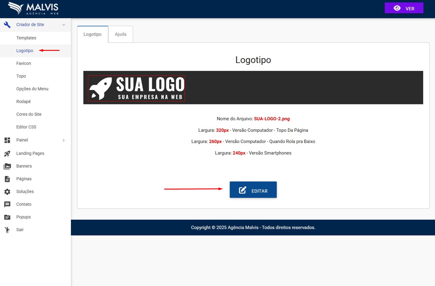 Para Atualizar o logotipo do site, acesse Criador de Site / Logotipo e clique no botão Editar