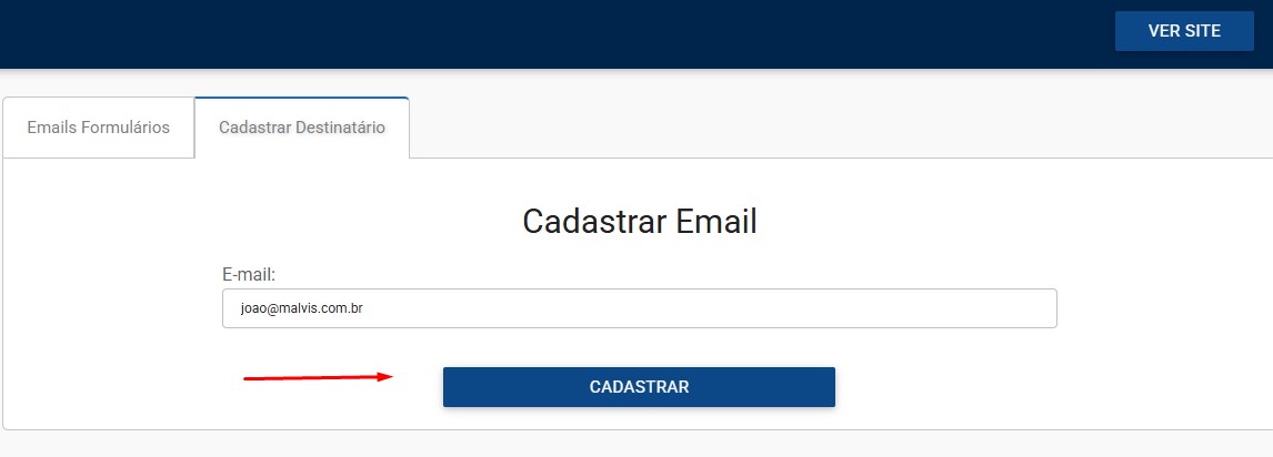 Preencha o email desejado e clique em Cadastrar. Pronto! O email está cadastrado.