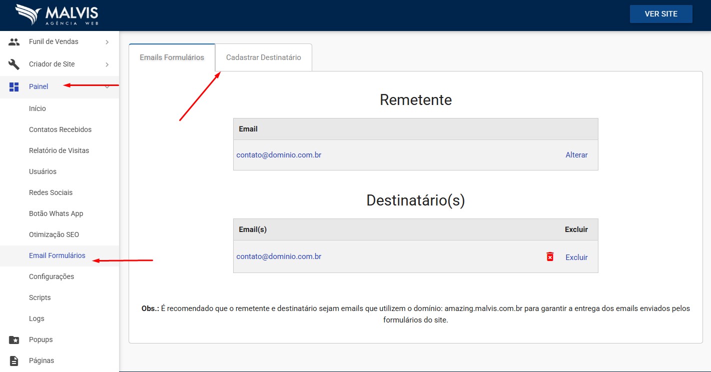 Para alterar o(s) email(s) destinatário(s) dos formulários de contato do seu website, acesse o gerenciador de conteúdo, no menu Painel / Email Formulários.