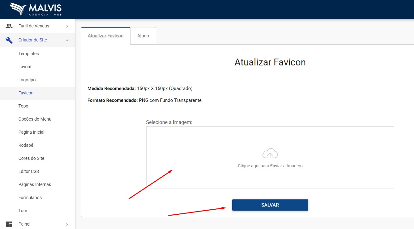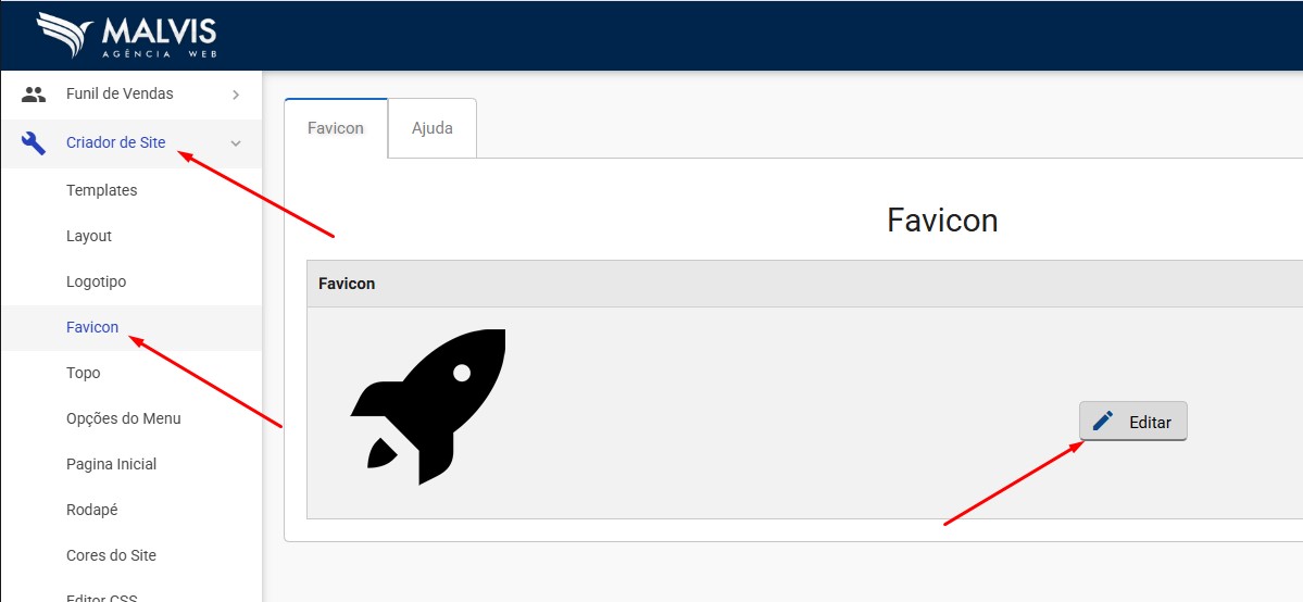 Acesse o Gerenciador de Conteúdo no menu: Criador de Site / Favicon e clique no botão Editar.