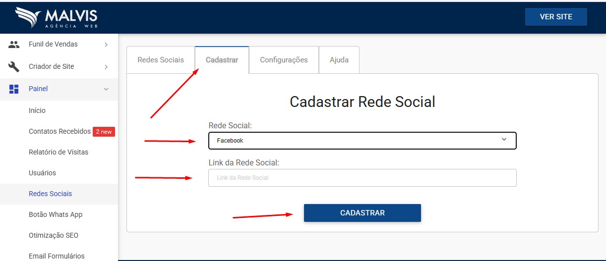Clique na aba Cadastrar para incluir uma nova Rede Social.