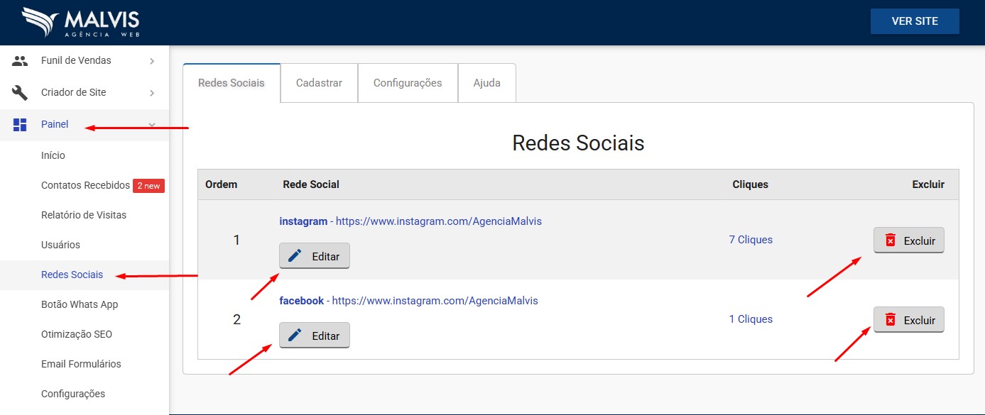 Clique no botão Excluir para remover a rede social do site.