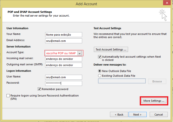 Quando você opta pela configuração POP, você deve ter ciência que, no momento que acessar seu e-mail via servidor em outros computadores, tablets ou smartphones, você não terá acesso às mensagens baixadas anteriormente em seu Outlook. A grande vantagem dessa configuração é otimizar o espaço da sua conta de e-mail, garantindo que a lotação da mesma não impeça que você receba novos e-mails dos seus contatos.