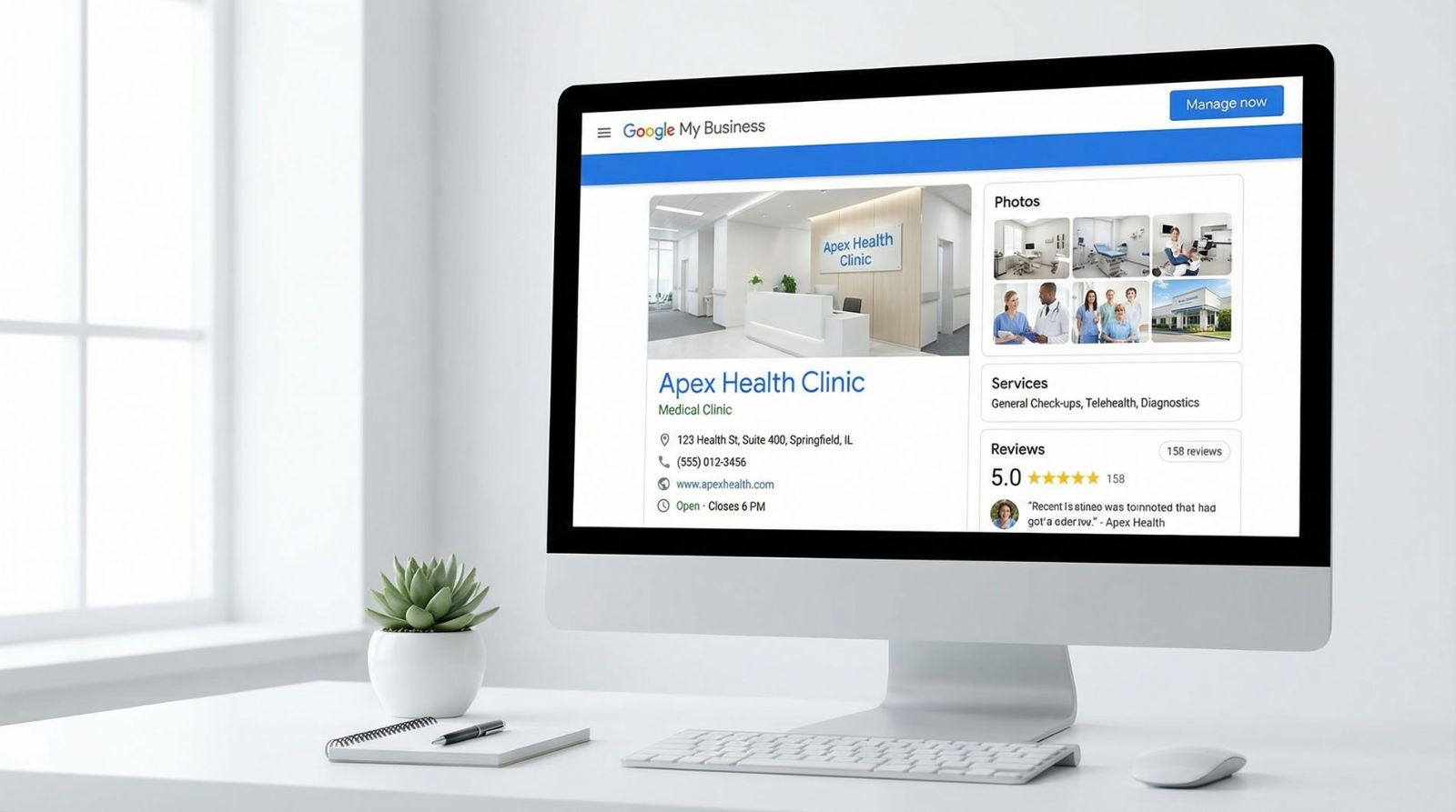 Acesse www.google.com/business, busque o nome da sua clínica e siga o processo de verificação. Caso o perfil ainda não exista, crie um do zero.