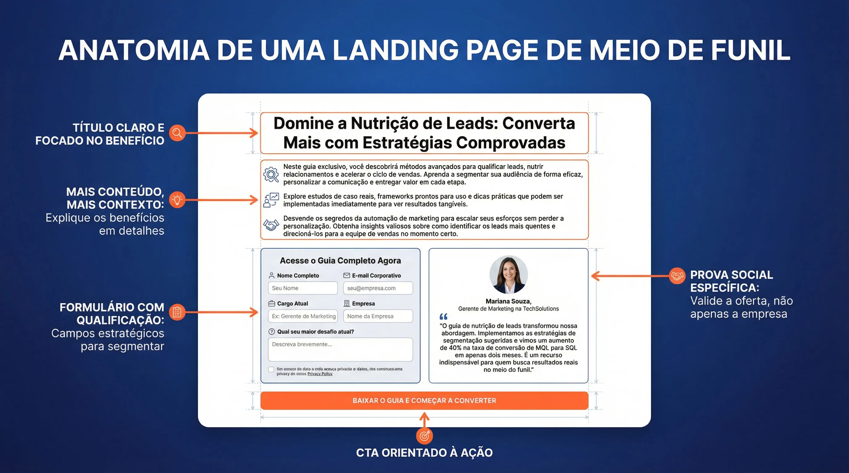 Enquanto uma landing page de topo captura contatos e uma de fundo fecha vendas, a landing page de meio de funil tem uma missão estratégica: educar, qualificar e nutrir o lead.