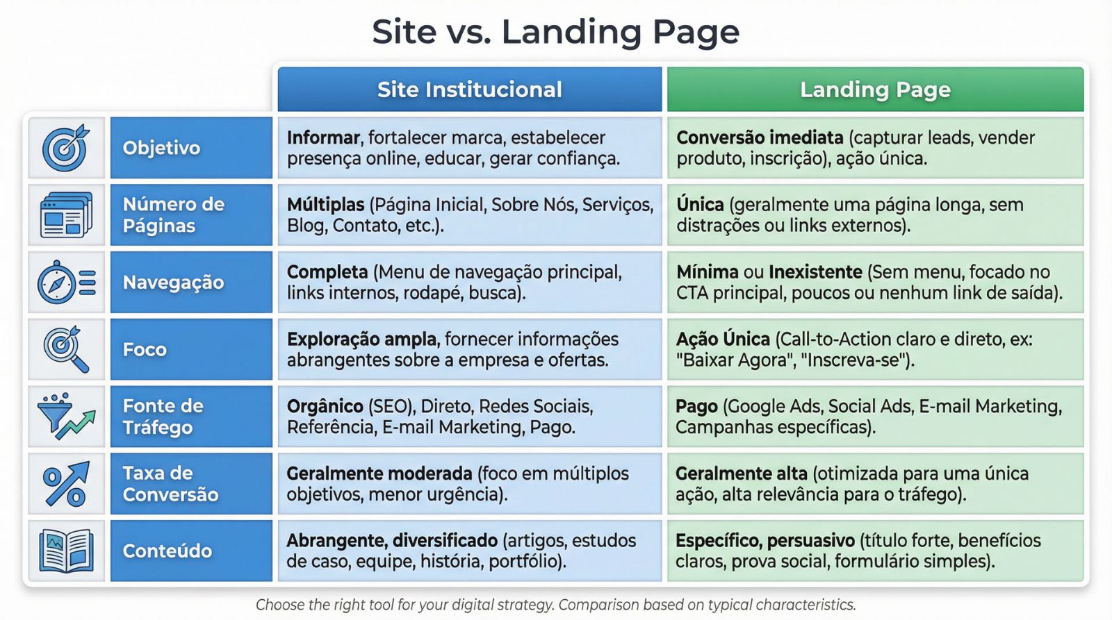 - Objetivo: site informa e constrói autoridade; landing page converte