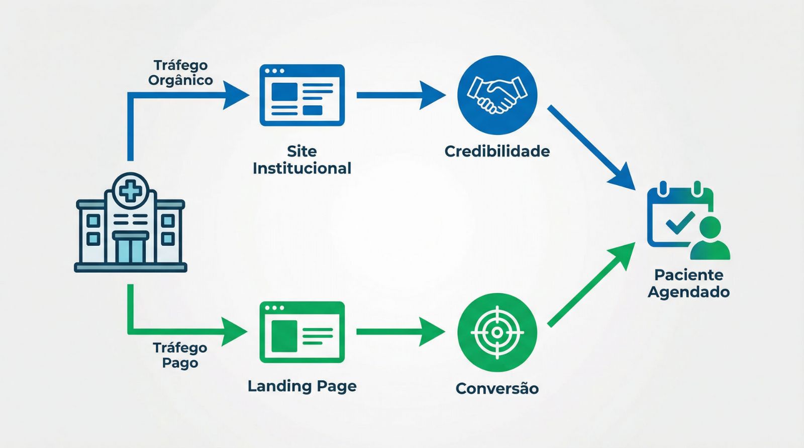 O paciente geralmente converte na landing page, mas valida sua decisão no site, consumindo conteúdo, conhecendo a equipe e reforçando a confiança antes do agendamento.