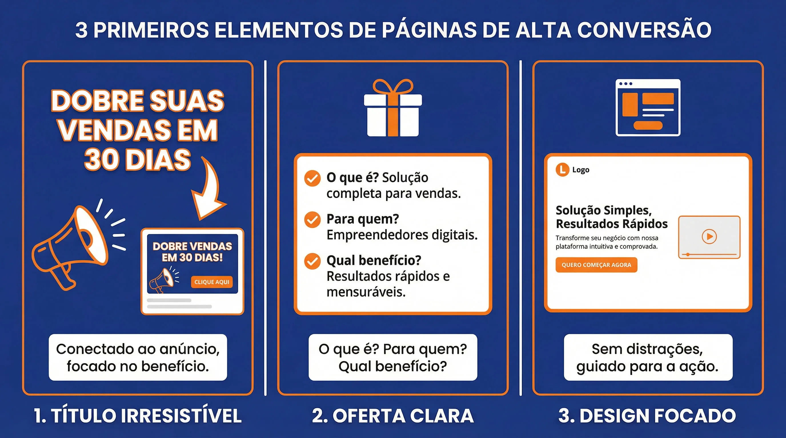 Um bom título precisa ser claro, direto e focado no benefício principal da oferta. O visitante deve entender imediatamente o que ele ganha ao permanecer na página.