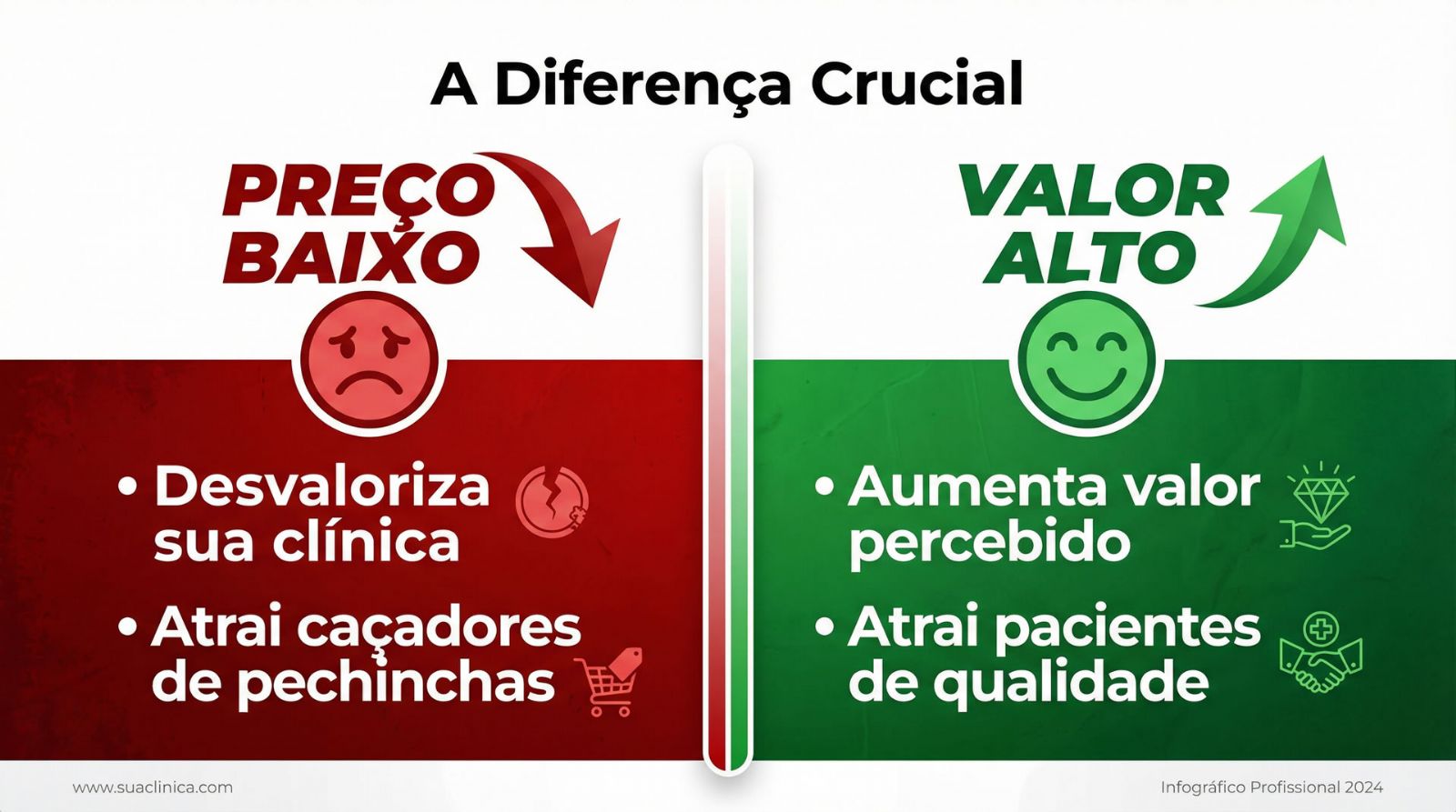 Esse tipo de abordagem atrai o paciente errado: o caçador de pechinchas. Além disso, desvaloriza seu serviço, sua marca e sua autoridade.