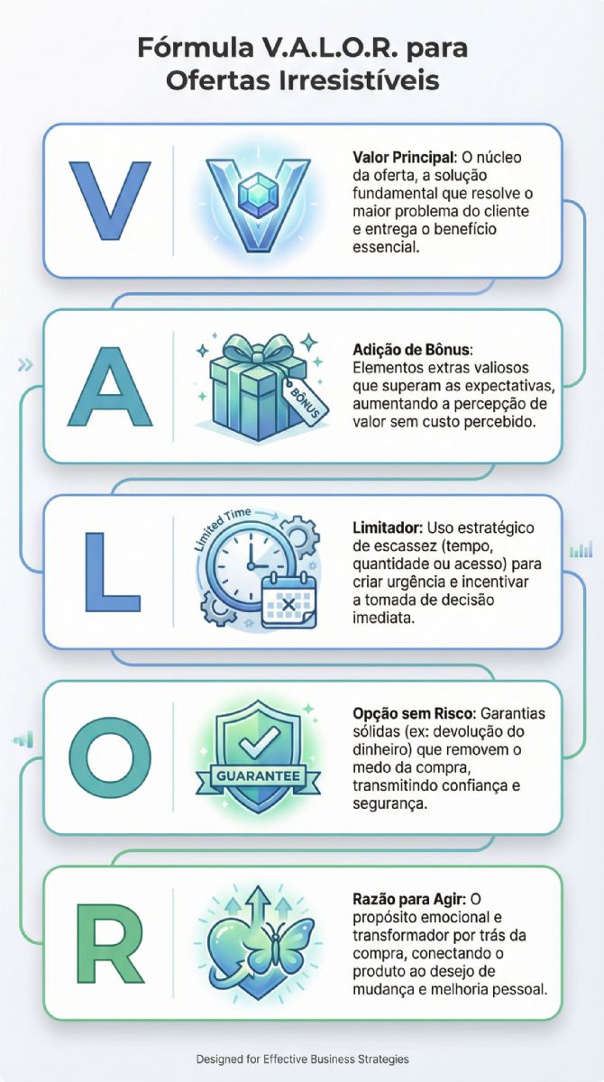 Para facilitar a aplicação prática, utilizamos a fórmula V.A.L.O.R., composta por cinco pilares estratégicos.