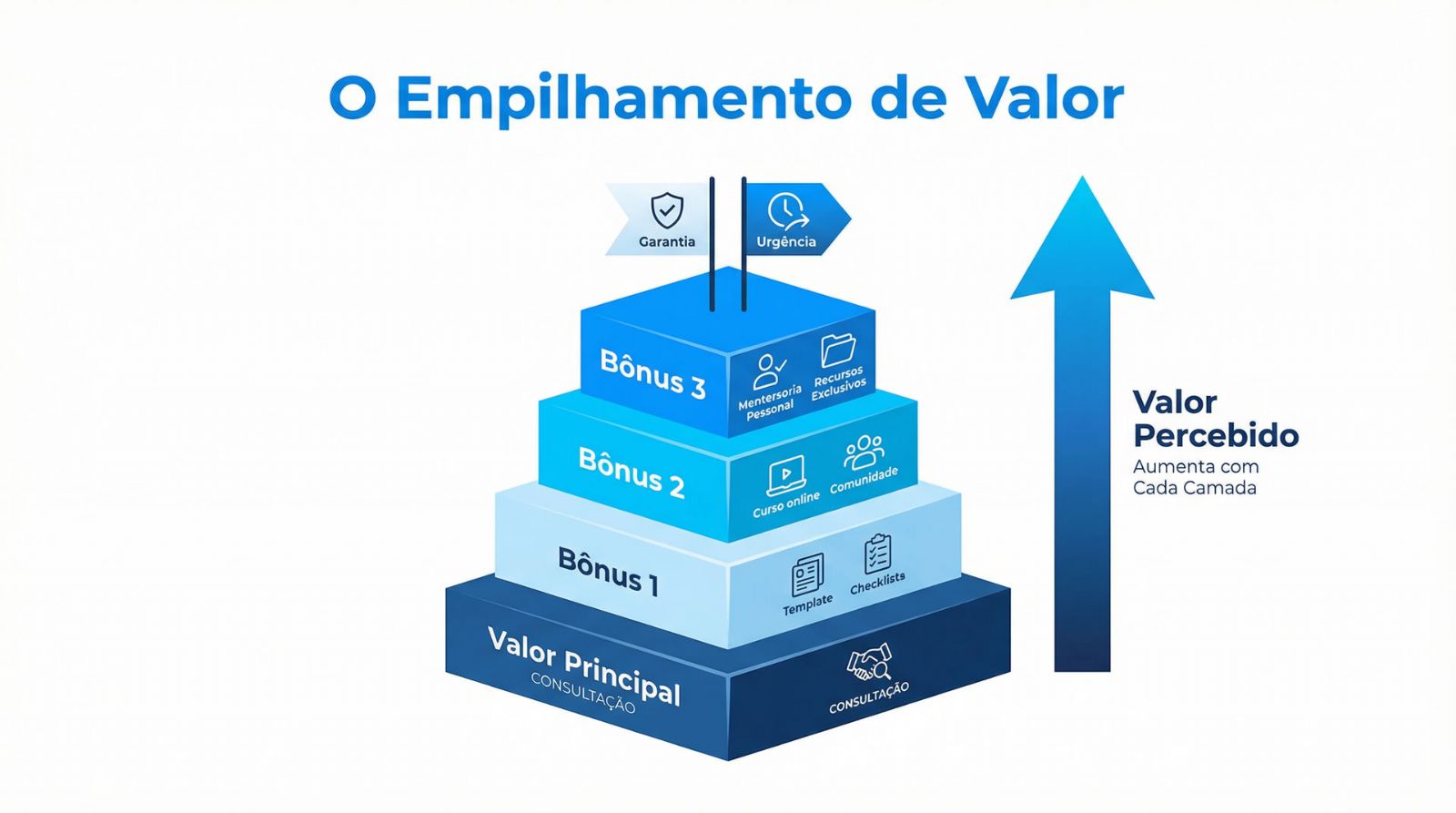 Aqui acontece a mágica da conversão. Você adiciona elementos de alto valor percebido e baixo custo operacional.