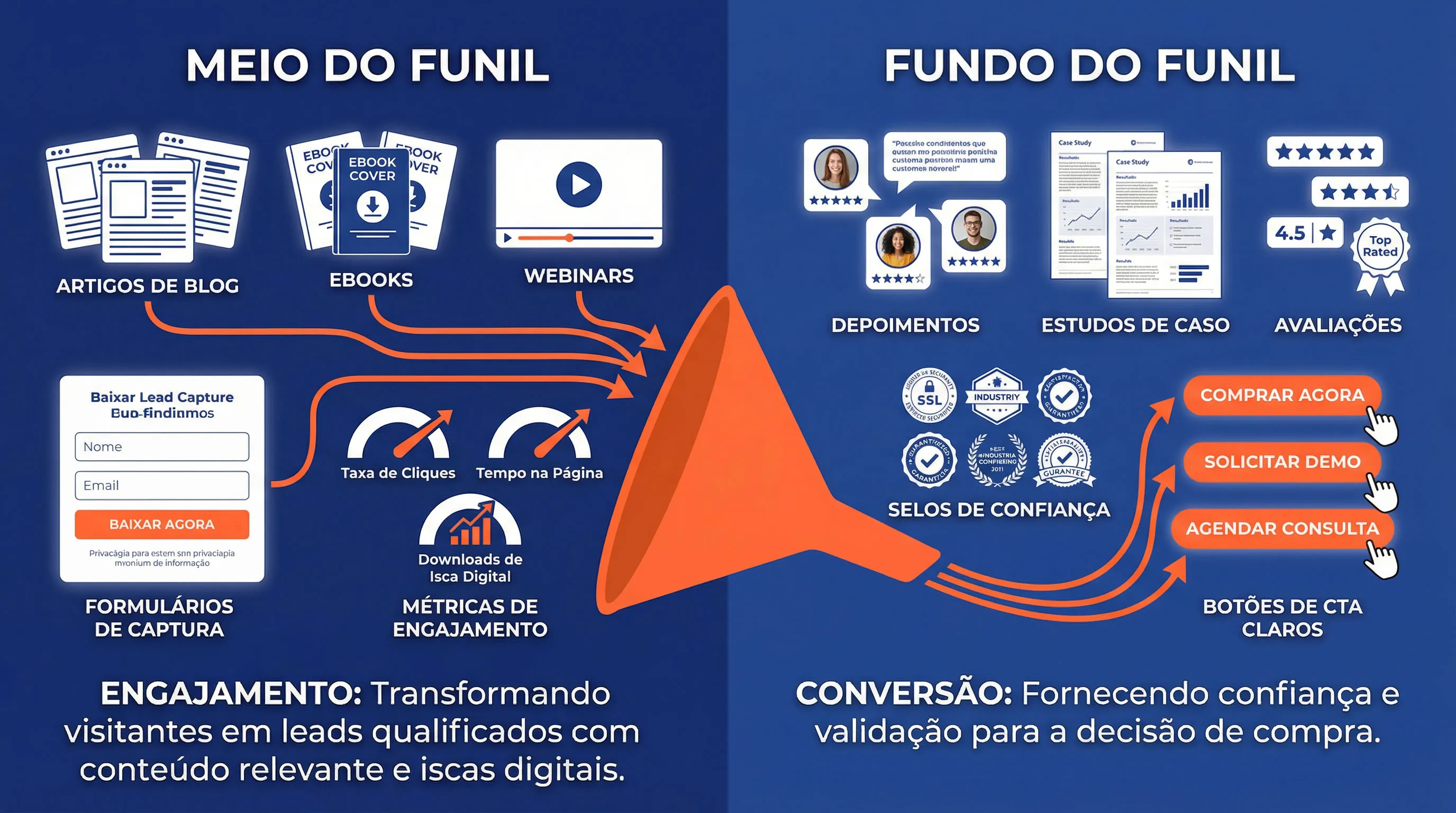 No meio do funil, o site trabalha para transformar o interesse inicial em uma oportunidade real de negócio.